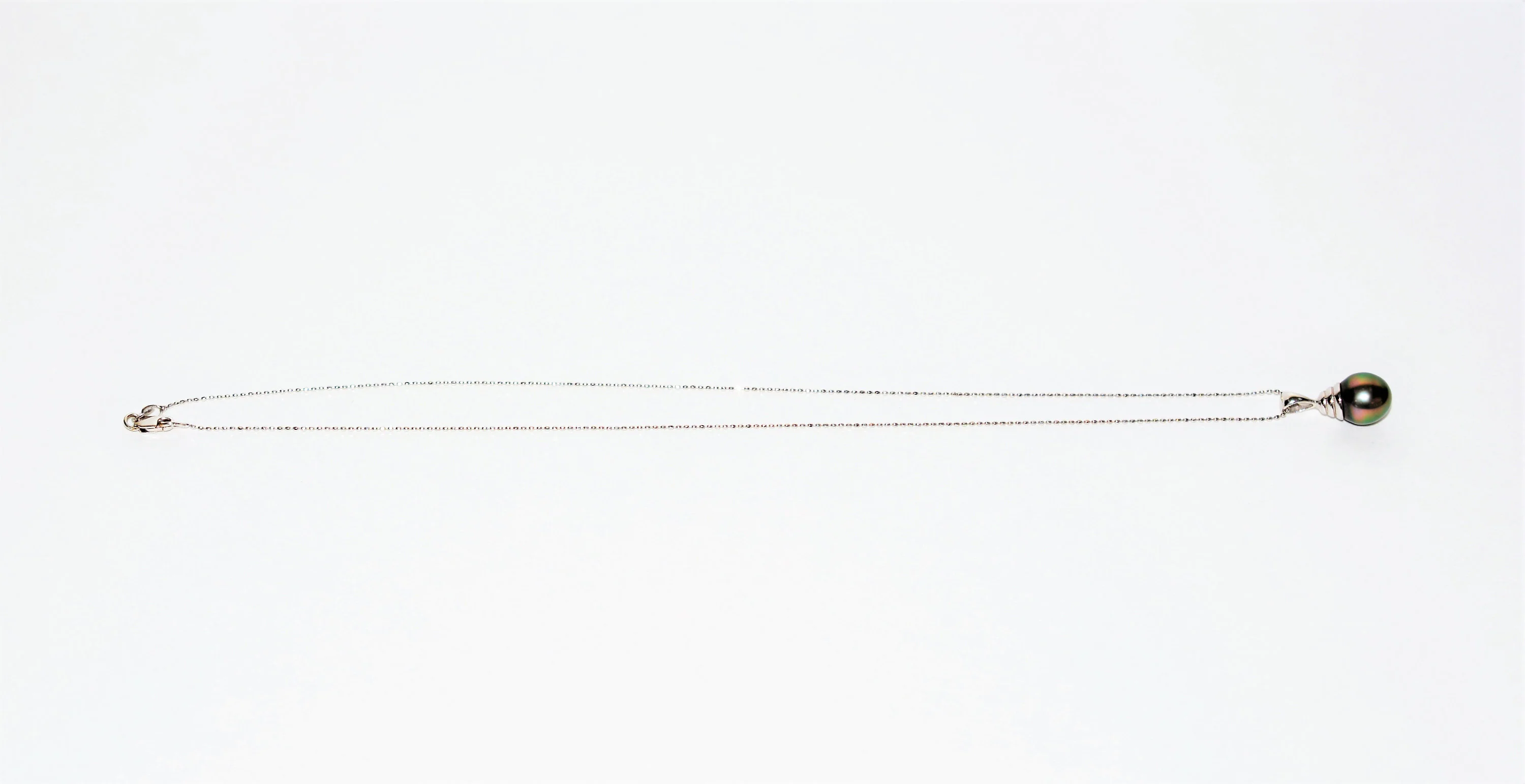 The Natural Tahitian Pearl is very well cut and polished with no flaws, chips, or surface scratches. It has vivid saturation and is a dazzling black-gray color! Photos are taken under professional lighting and are magnified at 50x zoom to show details that may not be visible to the naked eye. The pendant is clearly hallmarked 14K on the loop, and is hung on a .90mm thick, 14K solid white gold (not hollow), 16” bead-chain necklace that is also clearly hallmarked 14K on the lobster claw clasp closure. When worn, the pendant drop is 19mm from the chain.