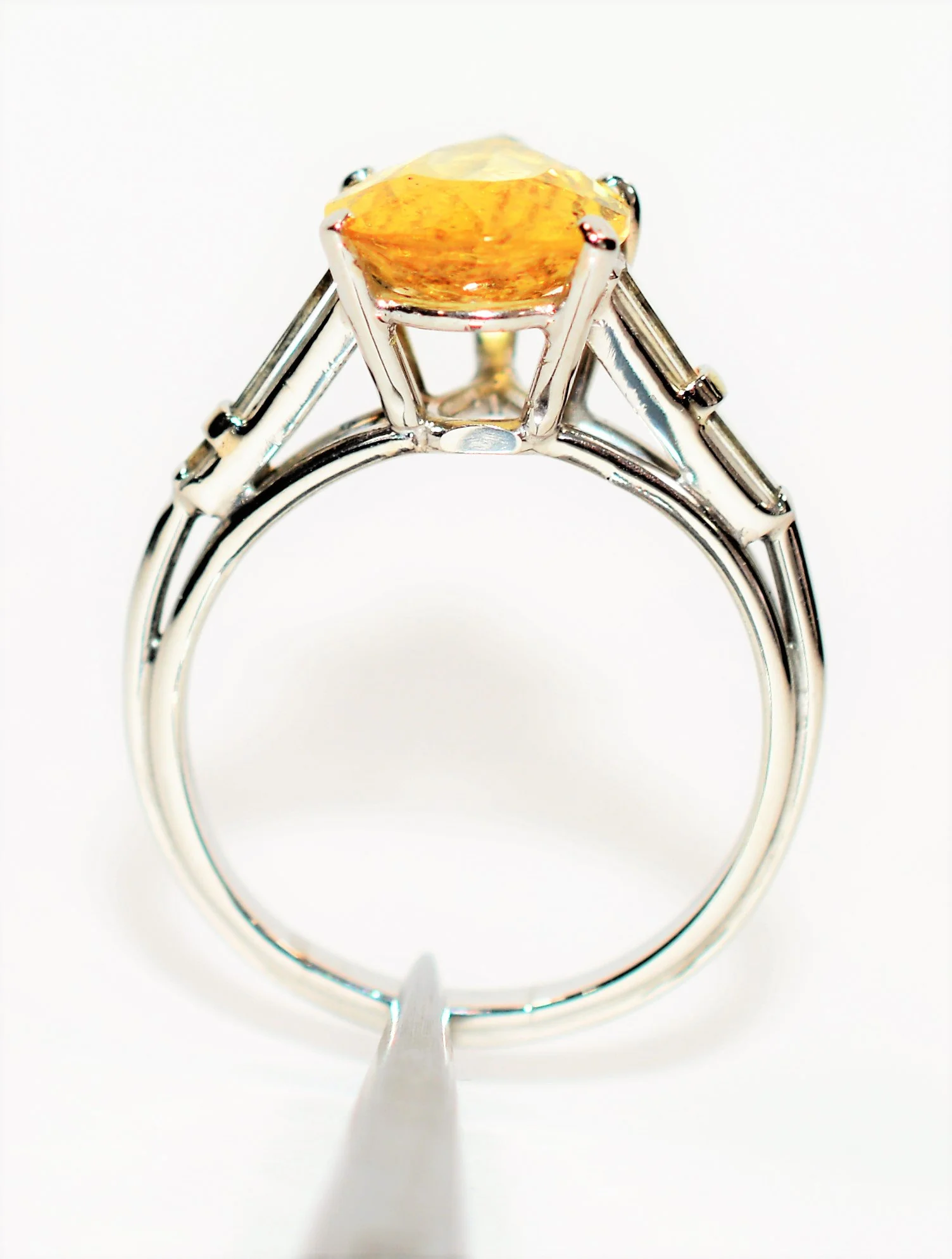 The 4.09 carat, Natural Golden Beryl has vivid saturation and excellent clarity with no visible inclusions, and is a sparkling golden-yellow color! Photos are taken under professional lighting and are magnified at 50x zoom to show details that may not be visible to the naked eye. Accenting the rare gemstone are 1.00-6.50mm baguette brilliant cut, natural Diamond accents (4 total) that are F color with VS2 clarity and weigh a combined total of 0.85 carats. The ring is clearly hallmarked PLATINUM on the inside of the 3.75mm band. When worn, the top of the ring/stone is elevated about 9.25mm from the finger.