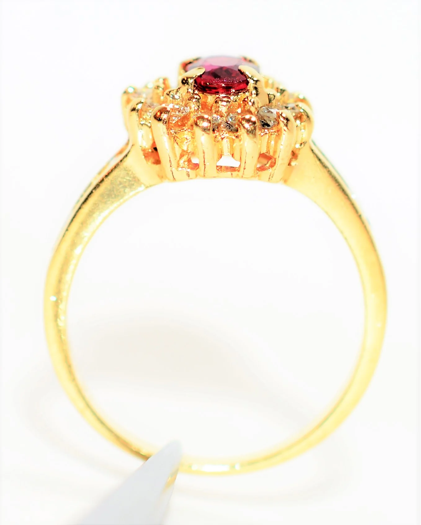 The .40 carat, Natural Ruby has vivid saturation and excellent clarity with no visible inclusions and is a mesmerizing raspberry-red color! Pictures have been magnified at 50x zoom to show details that may not be visible to the naked eye. Accenting the rare gemstone are 1.50mm round brilliant cut, natural Diamond accents (18 total) that are I color with VS2-SI1 clarity and weigh a combined total of 0.27 carats. The ring is clearly hallmarked 14K on the inside of the 3.5mm band. When worn, the top of the ring/stone is elevated about 5.5mm from the finger.