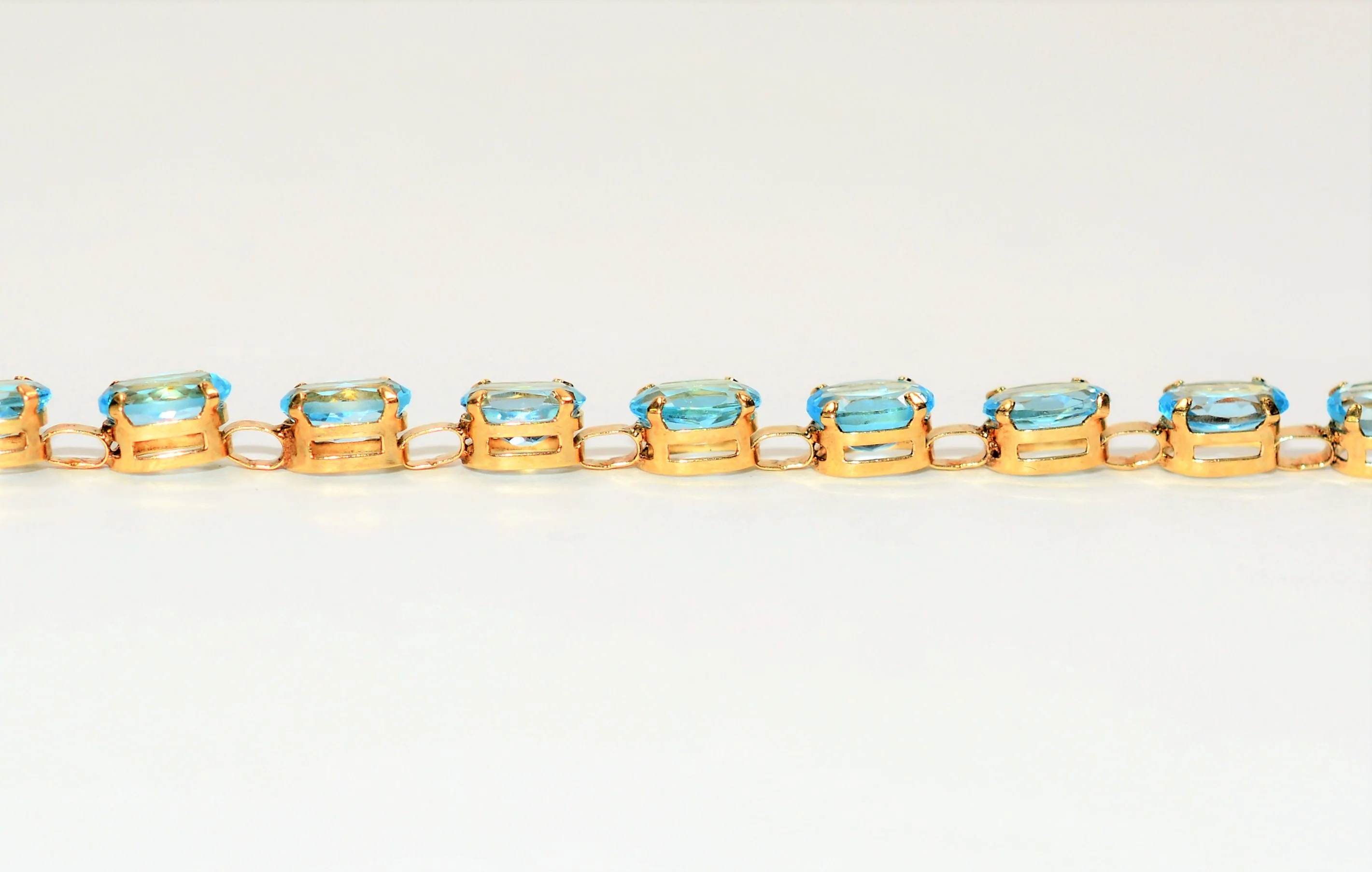 These twenty, .58 carat, Natural Swiss Blue Topaz have vivid saturation and excellent clarity with no visible inclusions and are a sparkling sky-blue color! Photos are taken under professional lighting and are magnified at 50x zoom to show details that may not be visible to the naked eye. The bracelet measures 7.5” in length, and is clearly hallmarked 10K on sturdy slide lock clasp.